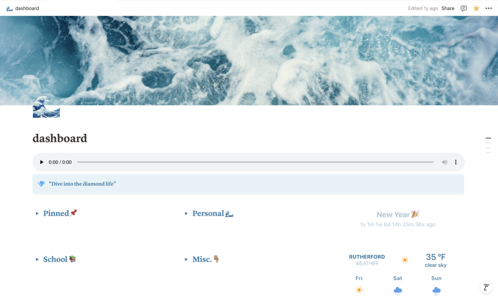 Introducing the "Diamond Life" Notion template—a sleek and organized digital workspace designed to streamline your personal, academic, and miscellaneous tasks. With dedicated sections for personal projects, school assignments, and various other activities, this template ensures all aspects of your life are efficiently managed in one place. Integrated features like a live countdown timer and real-time weather updates keep you informed and on track. Elevate your productivity and embrace the diamond life with this comprehensive Notion template.